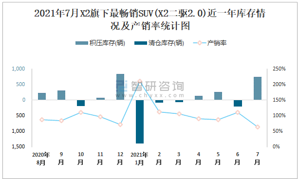2021年7月X2旗下最暢銷SUV(X2二驅2.0)近一年庫存情況及產銷率統計圖
