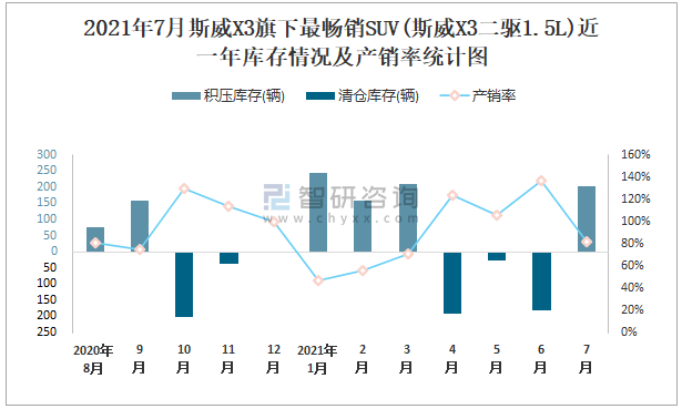 2021年7月斯威X3旗下最暢銷SUV(斯威X3二驅(qū)1.5L)近一年庫存情況及產(chǎn)銷率統(tǒng)計圖