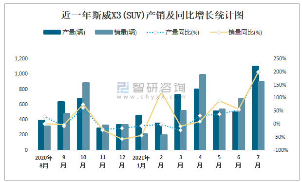 近一年斯威X3(SUV)產(chǎn)銷及同比增長統(tǒng)計圖