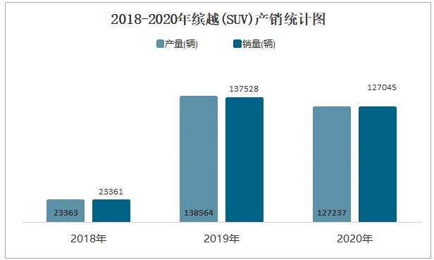 根據中國汽車工業協會數據可知:2021年7月繽越(SUV)產量為7826輛,同比下降37.5%,銷量為7795輛,同比下降33.9%,當月產銷率為99.6%;2021年1-7月繽越(SUV)累計產量為75977輛,同比增長26.1%,累計銷量為75613輛,同比增長27.8%,累計產銷率為99.52%;2018-2020年繽越(SUV)產銷量均在2019年達到最高值,此后小幅度下滑,且近3年總產量大于總銷量,積壓了庫存1230輛。