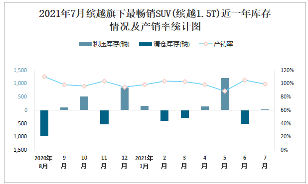 2021年7月繽越旗下最暢銷SUV(繽越1.5T)近一年庫存情況及產銷率統計圖