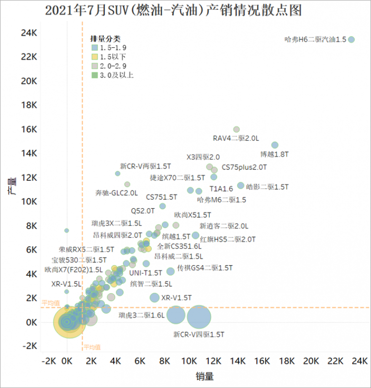 從下圖散點圖可看出,以產銷平均值作為四象限分界線,大部分燃油SUV集中在第一象限,即產多銷多,特別是哈弗H6二驅汽油1.5這款SUV,產量和銷量仍遙遙領先于其他燃油SUV;第三象限和第四象限SUV,其產銷率較高(散點大小代表了產銷率),說明大量產銷量不理想的SUV將庫存清理作為主要任務,銷量排名靠前的SUV,以1.5-1.9和2.0-2.9排量為主。