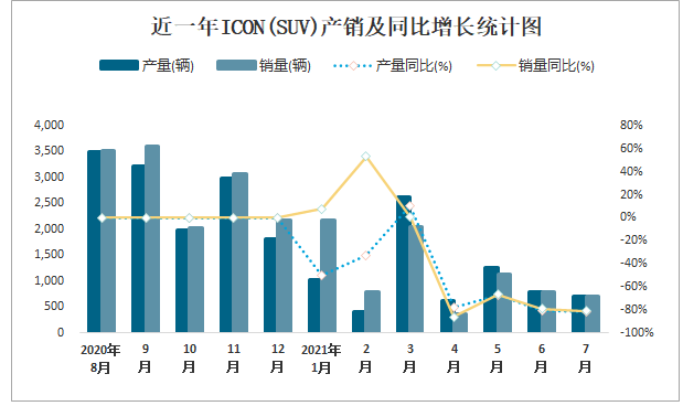 根據(jù)中國汽車工業(yè)協(xié)會數(shù)據(jù)可知:2021年7月ICON(SUV)產(chǎn)量為703輛,同比下降81.5%,銷量為713輛,同比下降81%,當(dāng)月產(chǎn)銷率為101.42%;2021年1-7月ICON(SUV)累計產(chǎn)量為7410輛,同比下降62.1%,累計銷量為8031輛,同比下降55.4%,累計產(chǎn)銷率為108.38%;且2020年ICON(SUV)總產(chǎn)量大于總銷量,積壓了庫存1573輛。