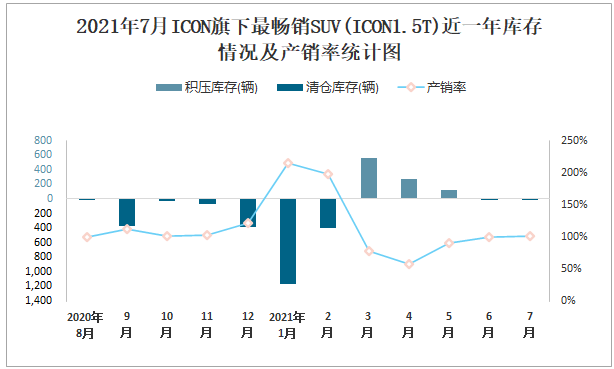 2021年7月ICON旗下最暢銷SUV(ICON1.5T)近一年庫存情況及產(chǎn)銷率統(tǒng)計圖