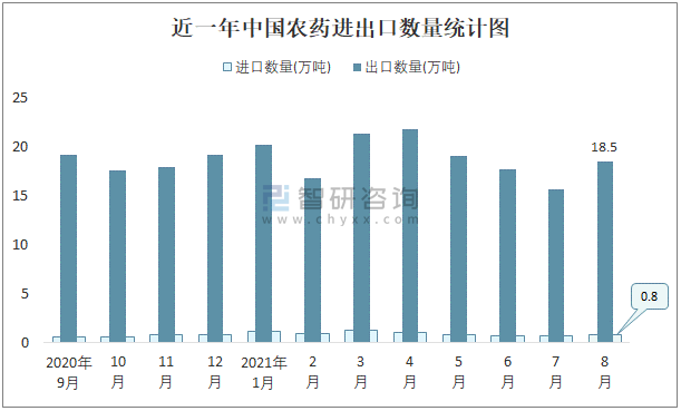 近一年中國農藥進出口數量統計圖