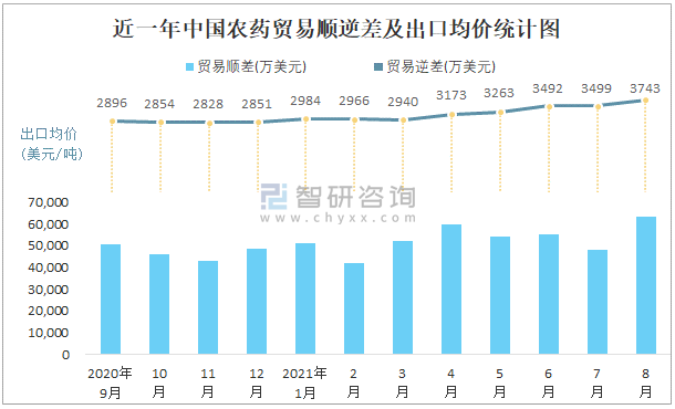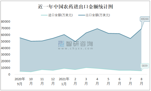 根據中國石油和化學工業聯合會數據顯示:2021年8月中國農藥進口數量為0.8萬噸,出口數量為18.5萬噸;進口金額為5839萬美元,出口金額為69244萬美元;近一年中國農藥出口總金額大于進口總金額,貿易順差為主,8月出口均價3743美元/噸。