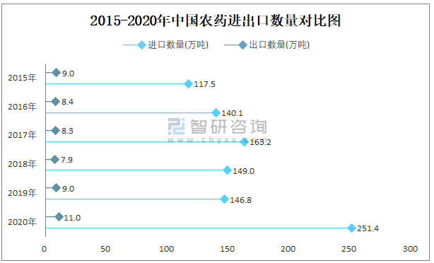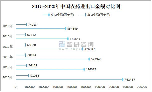 2015-2020年中國農藥進出口數量對比統計圖