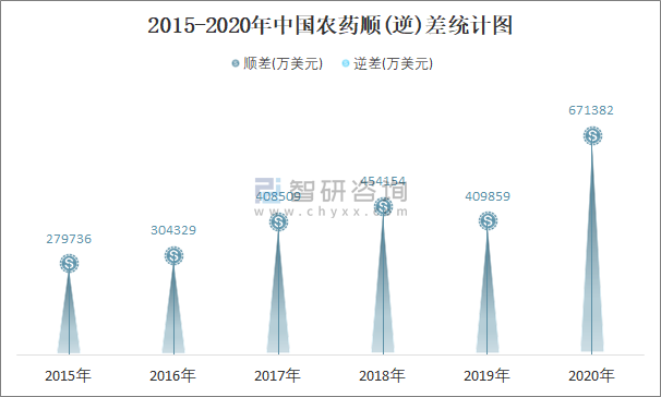 2015-2020年中國農藥順(逆)差統計圖