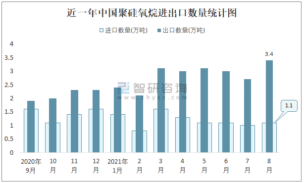 2021年8月中國聚硅氧烷進(jìn)出口數(shù)量分別為1.1萬噸和3.4萬噸