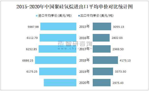 2015-2020年中國聚硅氧烷進(jìn)出口平均單價對比統(tǒng)計圖