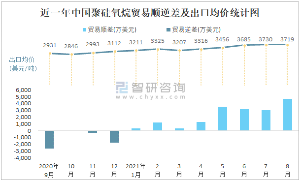 近一年中國聚硅氧烷順逆差及出口均價統(tǒng)計圖