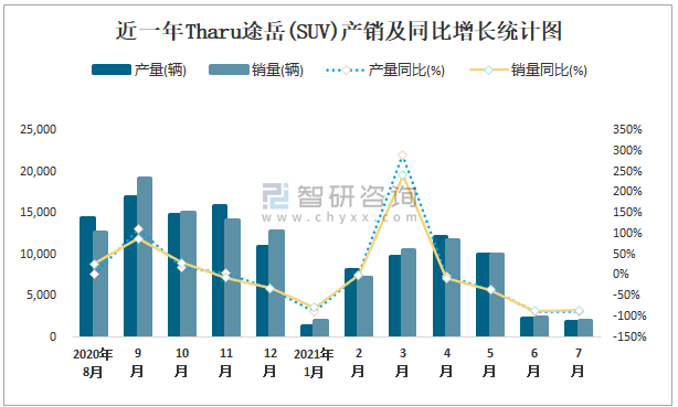近一年THARU途岳(SUV)產(chǎn)銷及同比增長統(tǒng)計圖