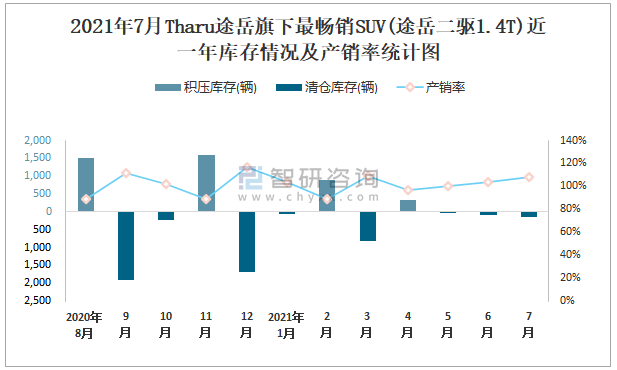 2021年7月THARU途岳旗下最暢銷SUV(途岳二驅(qū)1.4T)近一年庫存情況及產(chǎn)銷率統(tǒng)計圖