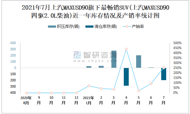 根據中國汽車工業協會數據統計可知:2021年7月上汽MAXUSD90(SUV)旗下共有4款SUV在銷售,其中上汽MAXUSD90四驅2.0L柴油相對暢銷;近一年上汽MAXUSD90四驅2.0L柴油共積壓庫存69輛,其產銷率存在一定幅度波動,2021年4月產銷率最高(437.65%),清倉庫存287輛,2021年5月產銷率偏低(21.54%),積壓庫存204輛。