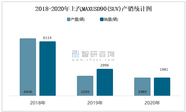 2018-2020年上汽MAXUSD90(SUV)產銷統計圖