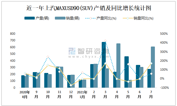 根據中國汽車工業協會數據可知:2021年7月上汽MAXUSD90(SUV)產量為274輛,同比增長58.4%,銷量為608輛,同比增長171.4%,當月產銷率為221.9%;2021年1-7月上汽MAXUSD90(SUV)累計產量為2437輛,同比增長178.8%,累計銷量為2421輛,同比增長180.5%,累計產銷率為99.34%;2018-2020年上汽MAXUSD90(SUV)產銷量均在2018年達到最高值,此后逐年遞減,且近3年總銷量大于總產量,清倉庫存463輛。