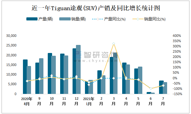 近一年TIGUAN途觀(SUV)產銷及同比增長統計圖
