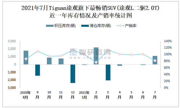 2021年7月TIGUAN途觀旗下最暢銷SUV(途觀L二驅2.0T)近一年庫存情況及產銷率統計圖