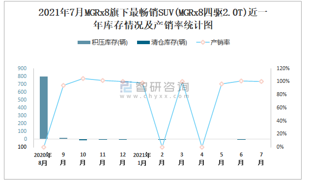 2021年7月MGRX8旗下最暢銷SUV(MGRx8四驅2.0T)近一年庫存情況及產銷率統計圖