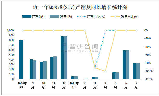 根據中國汽車工業協會數據可知:2021年7月MGRx8(SUV)產量為328輛,同比下降0%,銷量為328輛,同比下降0%,當月產銷率為100%;2021年1-7月MGRx8(SUV)累計產量為1155輛,同比增長89.3%,累計銷量為1154輛,同比增長89.2%,累計產銷率為99.91%;且2020年MGRx8(SUV)總產量大于總銷量,積壓了庫存7輛。