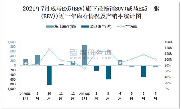 2021年7月威馬EX5(BEV)旗下最暢銷SUV(威馬EX5二驅(BEV))近一年庫存情況及產銷率統計圖