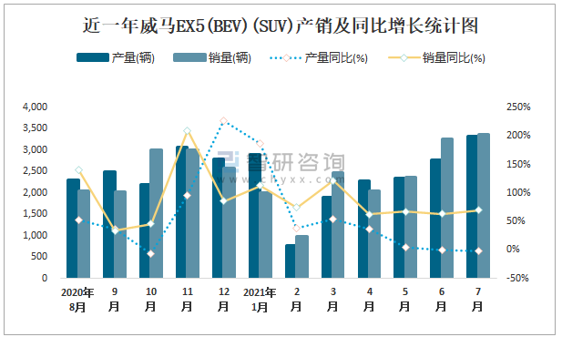根據中國汽車工業協會數據可知:2021年7月威馬EX5(BEV)(SUV)產量為3336輛,同比下降1.5%,銷量為3373輛,同比增長70%,當月產銷率為101.11%;2021年1-7月威馬EX5(BEV)(SUV)累計產量為16318輛,同比增長26.7%,累計銷量為16546輛,同比增長78.1%,累計產銷率為101.4%;且2020年威馬EX5(BEV)(SUV)總產量大于總銷量,積壓了庫存3782輛。