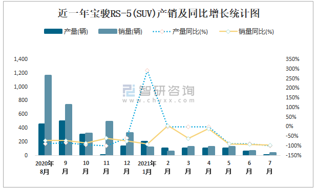 根據中國汽車工業協會數據可知:2021年7月寶駿RS-5(SUV)產量為10輛,同比下降99.1%,銷量為38輛,同比下降96.1%,當月產銷率為380%;2021年1-7月寶駿RS-5(SUV)累計產量為700輛,同比下降73.8%,累計銷量為679輛,同比下降85.1%,累計產銷率為97%;2019-2020年寶駿RS-5(SUV)產銷量大幅度下滑,且近2年總產量大于總銷量,積壓了庫存68輛。