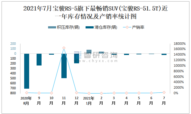 2021年7月寶駿RS-5旗下最暢銷SUV(寶駿RS-51.5T)近一年庫存情況及產銷率統計圖