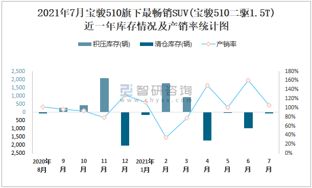 2021年7月寶駿510旗下最暢銷SUV(寶駿510二驅1.5T)近一年庫存情況及產銷率統計圖