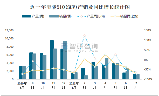 近一年寶駿510(SUV)產銷及同比增長統計圖