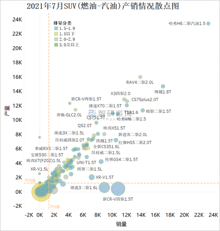 從下圖散點圖可看出,以產銷平均值作為四象限分界線,大部分燃油SUV集中在第一象限,即產多銷多,特別是哈弗H6二驅汽油1.5這款SUV,產量和銷量仍遙遙領先于其他燃油SUV;第三象限和第四象限SUV,其產銷率較高(散點大小代表了產銷率),說明大量產銷量不理想的SUV將庫存清理作為主要任務,銷量排名靠前的SUV,以1.5-1.9和2.0-2.9排量為主。