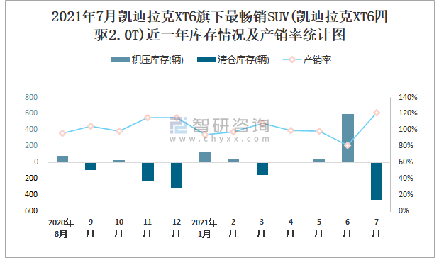 2021年7月凱迪拉克XT6旗下最暢銷SUV(凱迪拉克XT6四驅(qū)2.0T)近一年庫(kù)存情況及產(chǎn)銷率統(tǒng)計(jì)圖