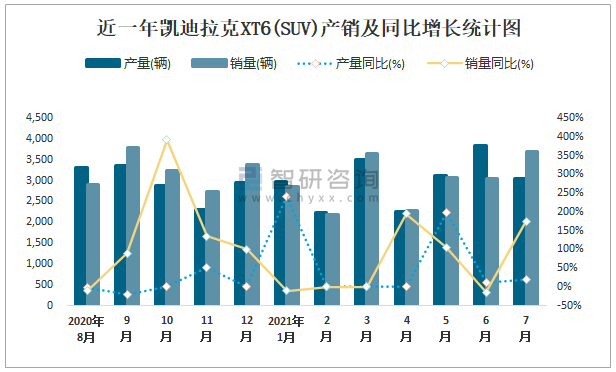 近一年凱迪拉克XT6(SUV)產(chǎn)銷及同比增長(zhǎng)統(tǒng)計(jì)圖