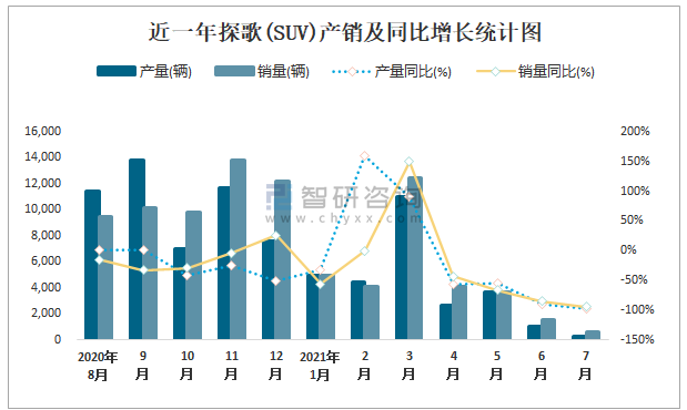 近一年探歌(SUV)產銷及同比增長統計圖