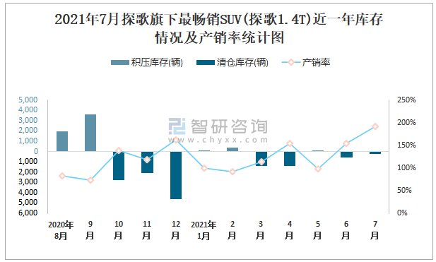 2021年7月探歌旗下最暢銷SUV(探歌1.4T)近一年庫存情況及產銷率統計圖