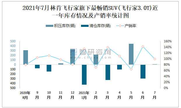 2021年7月林肯飛行家旗下最暢銷SUV(飛行家3.0T)近一年庫存情況及產銷率統計圖