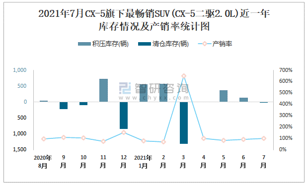 2021年7月CX-5旗下最暢銷SUV(CX-5二驅2.0L)近一年庫存情況及產銷率統計圖