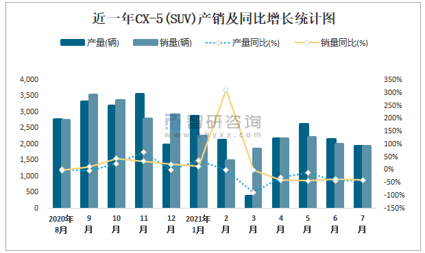 近一年CX-5(SUV)產銷及同比增長統計圖