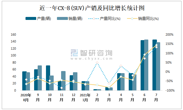 近一年CX-8(SUV)產銷及同比增長統計圖