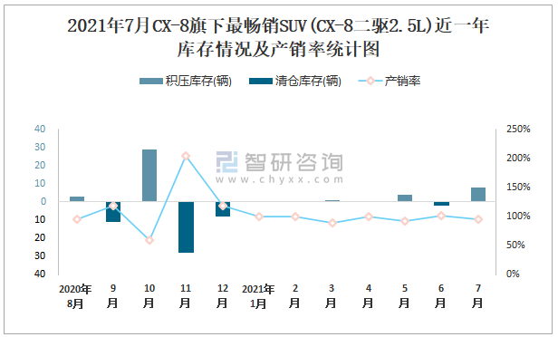 2021年7月CX-8旗下最暢銷SUV(CX-8二驅2.5L)近一年庫存情況及產銷率統計圖