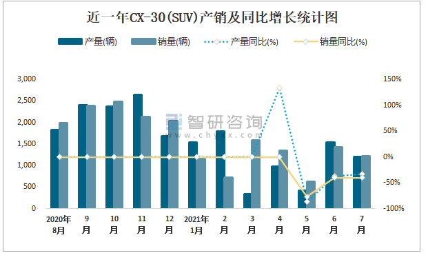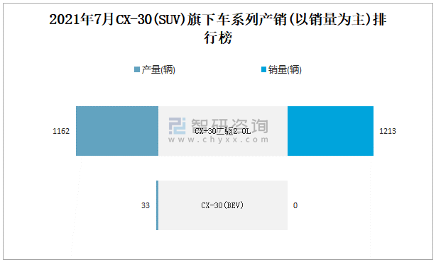 2021年7月CX-30(SUV)產銷量分別為1195輛和1213輛 當月產銷率為101.51%
