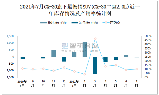 2021年7月CX-30旗下最暢銷SUV(CX-30二驅2.0L)近一年庫存情況及產銷率統計圖