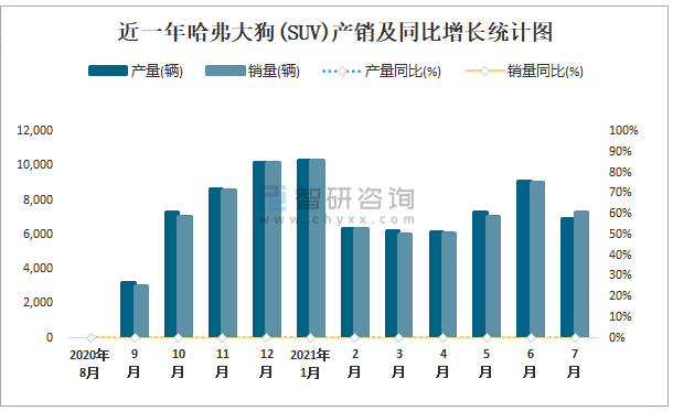 近一年哈弗大狗(SUV)產(chǎn)銷及同比增長統(tǒng)計(jì)圖