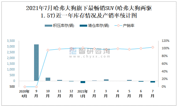 2021年7月哈弗大狗旗下最暢銷SUV(哈弗大狗兩驅(qū)1.5T)近一年庫存情況及產(chǎn)銷率統(tǒng)計(jì)圖