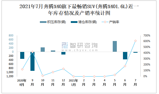 2021年7月奔騰X40旗下最暢銷SUV(奔騰X401.6L)近一年庫存情況及產銷率統計圖