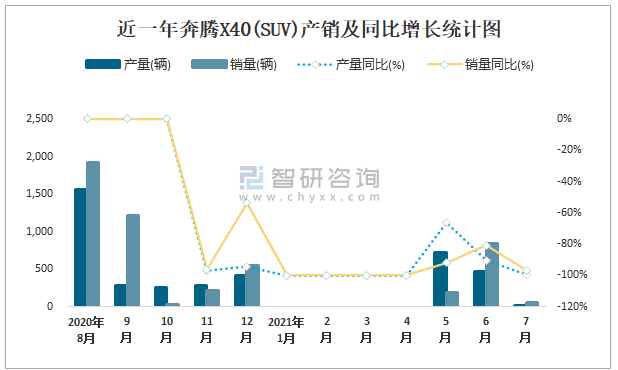 近一年奔騰X40(SUV)產銷及同比增長統計圖