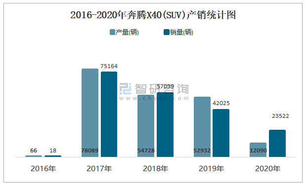 2016-2020年奔騰X40(SUV)產銷統計圖