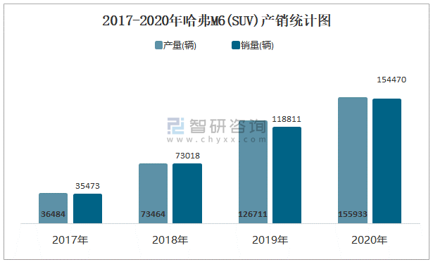 2017-2020年哈弗M6(SUV)產(chǎn)銷統(tǒng)計圖