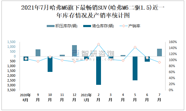 2021年7月哈弗M6旗下最暢銷SUV(哈弗M6二驅(qū)1.5)近一年庫存情況及產(chǎn)銷率統(tǒng)計圖