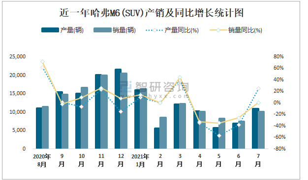 近一年哈弗M6(SUV)產(chǎn)銷及同比增長統(tǒng)計圖